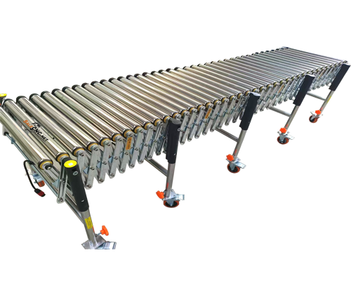 ภาพที่คุณแนบมาแสดงให้เห็นถึง สายพานลูกกลิ้งแบบยืดหดได้ (Flexible Roller Conveyor) ซึ่งนิยมใช้ในงานโลจิสติกส์และคลังสินค้า โดยเฉพาะในกระบวนการขนถ่ายสินค้า เช่น การโหลดหรือขนถ่ายพัสดุจากรถบรรทุก หรือการลำเลียงสินค้าในไลน์ผลิต